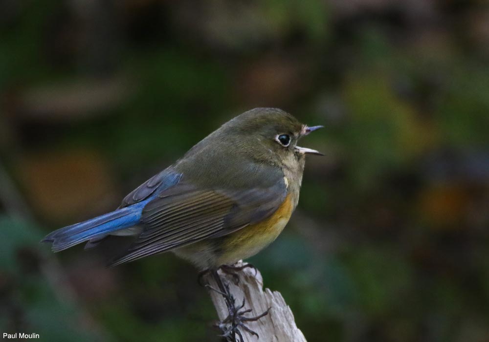 The number of European records of Red-flanked Bluetails during migration has also increased since the 1950s: they are mainly concentrated during the months of October and November, but some birds are also occasionally found in winter. For example, an immature male was found by Antonin Chesneau and S. Maffre in the regional nature reserve of Cambounet-sur-le-Sor (Tarn) on the 10th of December 2022, where it was still present on at least the 13th, a first winter male stayed near the village du Grais, in the department of Orne (France) from the 8th to the 14th of December 2021 (at least), and a first winter male was found in a larch forest near Montzen (Belgium) on the 5th of January 2018, where it was still present on at least the 5th of February.