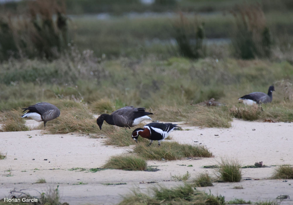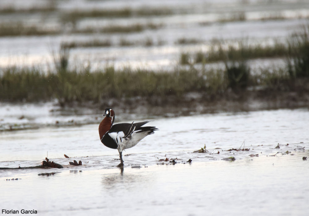The Red-breasted Goose (Branta ruficollis) is a small goose measuring 54–60 cm in length with a easily recognizable white, red and black plumage. It breeds in the tundra of northwestern Siberia, mainly on the Taimyr, Gydan and Yamal peninsulas. Before the 1960s, it wintered mainly along the western coast of the Caspian Sea (Azerbaijan-Iran), as well as in southern Iraq, but since the 1970s its wintering range has gradually shifted westwards, particularly to the western shore of the Black Sea, with small groups also staying in Hungary, Greece and Turkey. Individuals or small groups are also wintering more and more regularly in Western Europe: in November and December 2024, for example, three birds were seen in the company of Brant Geese (B. bernicla) in the salt meadows of the Bay of Mont-Saint-Michel (Manche/Ille-et-Vilaine) and the Arcachon Basin (Gironde).