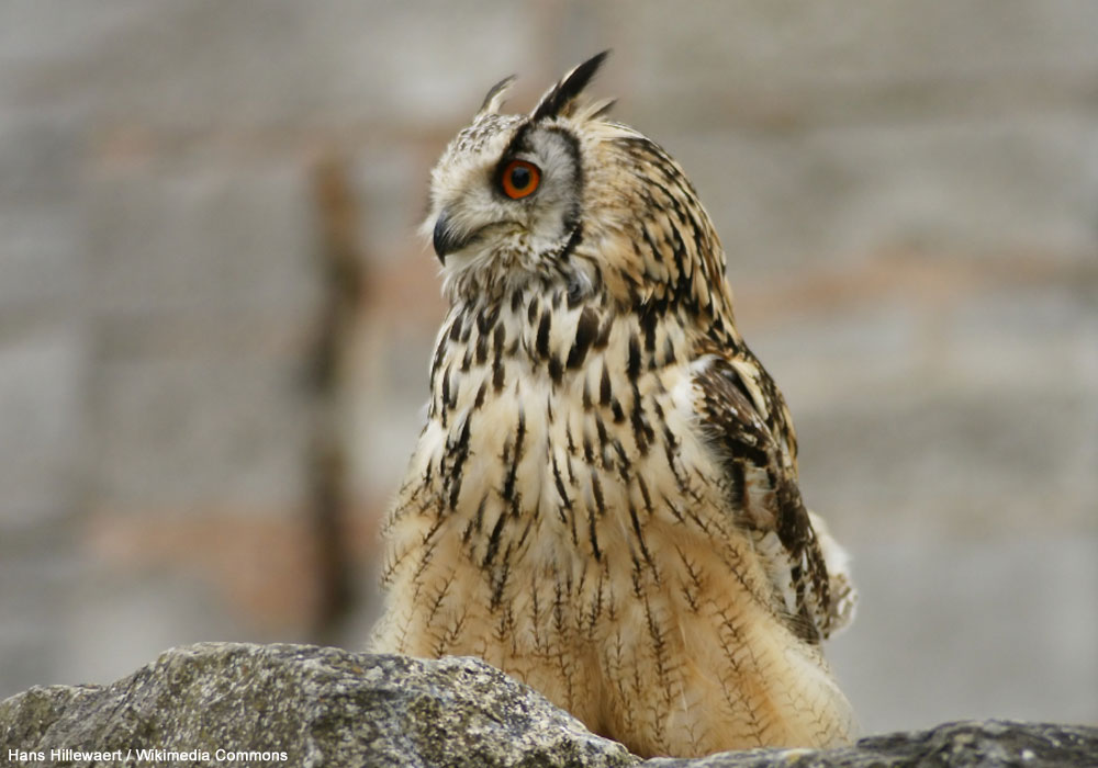 Le Grand-duc d’Europe (Bubo bubo) est le plus grand rapace nocturne d’Eurasie, avec une envergure de 160 à 188 cm et un poids de 2 à 2,5 kg pour le mâle et de 2,5 à 3,3 kg pour la femelle. Il est présent de l’Espagne à la Chine. C’est un prédateur puissant et éclectique, capable de tuer des proies diverses, des gros insectes aux mammifères de la taille du chevreuil, qu’il chasse dans des habitats variés : forêts, marais, prairies, cultures, steppes, déserts, maquis et même zones urbaines. Grâce à ses capacités d’adaptation et aux mesures de conservation prises à partir des années 1970, ses effectifs se sont progressivement reconstitués, et il colonise désormais les villes, où il n’hésite pas à nicher sur des bâtiments variés. Un couple s’est ainsi installé au cours du mois de décembre 2022 sur les remparts du lycée Joffre, dans la ville de Montpellier (Hérault) : trois jeunes sont nés en février 2023 (un mort en tombant de son nid), et l’un des deux restants a quitté le nid le 29 mars.
