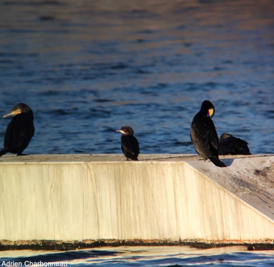 Des petits groupes de Grands Cormorans (Phalacrocorax carbo) se rassemblent sur les lacs, et en janvier 2025, un Cormoran pygmée (Microcarbo pygmaeus) a été noté parmi eux, donnant, avec les Fuligules nyrocas, un petit air « oriental » au site (lire Le Cormoran pygmée en France : vers une installation future ?). Il se pose souvent sur les structures blanches qui flottent au milieu du lac nord et qui sont visibles depuis le remblai (point 1 sur notre carte).