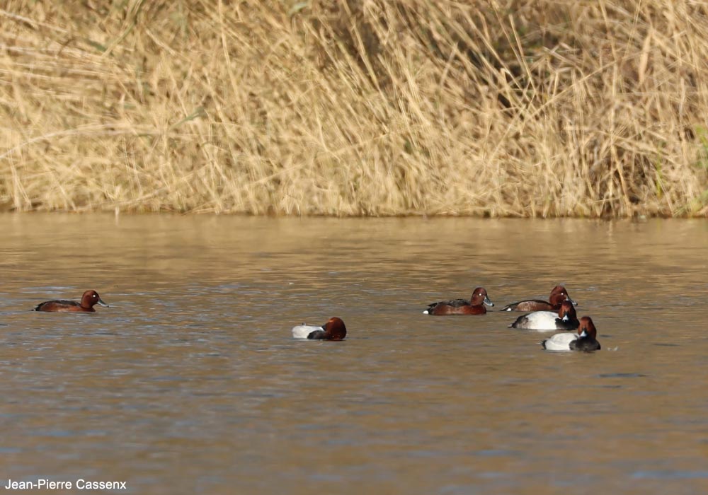 Fuligules nyrocas (Aythya nyroca) et milouins (A. ferina) sur le lac nord de l’Ove blanc (Drôme) en janvier 2025 (cliquez sur la photo pour l’agrandir). |