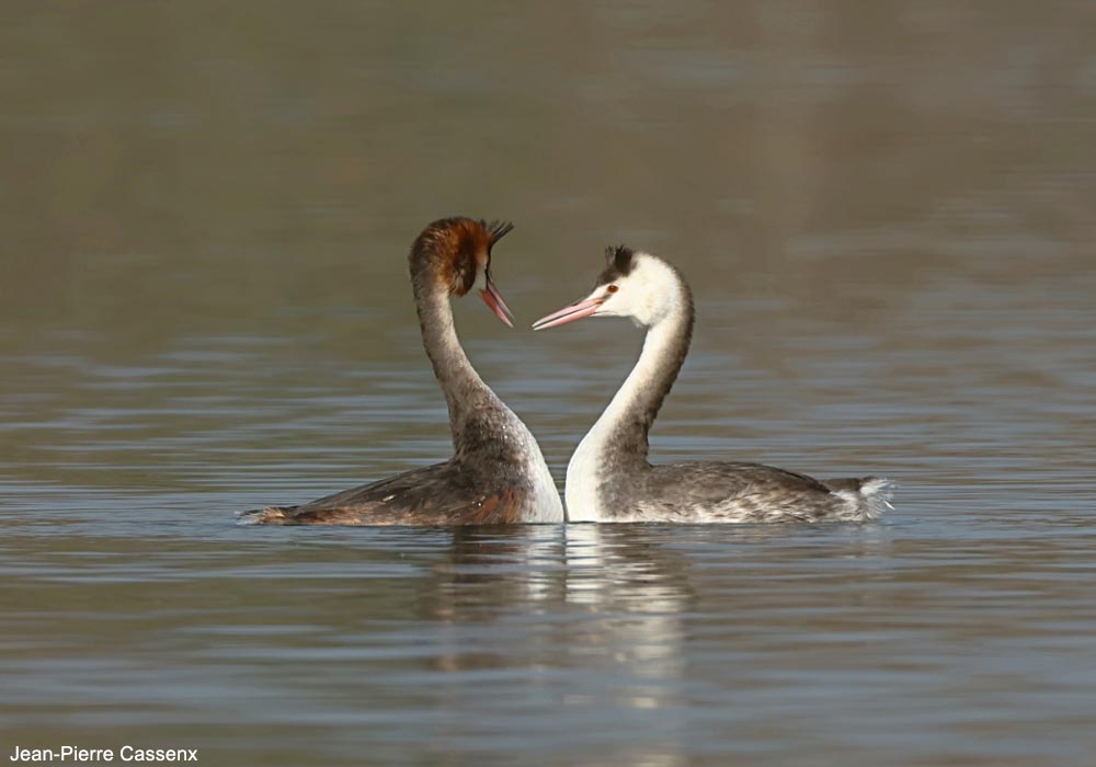Grèbes huppés (Podiceps cristatus) paradant sur les lacs de l’Ove blanc (Drôme) (cliquez sur la photo pour l’agrandir). |