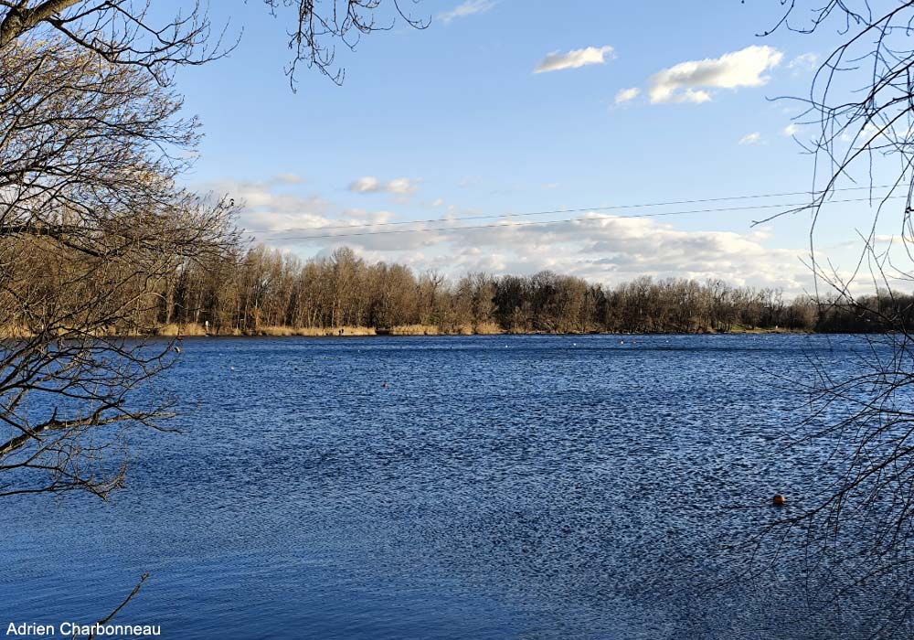 Le lac nord est complètement clôturé et est interdit d’accès, sauf pour les personnes autorisées à participer aux activités nautiques estivales organisées par l’exploitant de la base de loisirs. Le point d’observation le plus pertinent est situé sur le remblai le séparant de l’autre plan d’eau (point 1 sur notre carte et voir sa localisation sur Google Maps).
