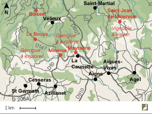 Carte des environs de Minerve (Hérault) : en rouge, quelques bons secteurs à explorer. |