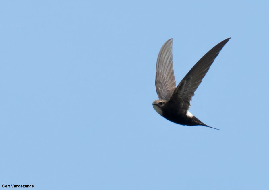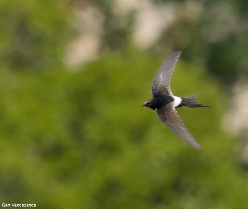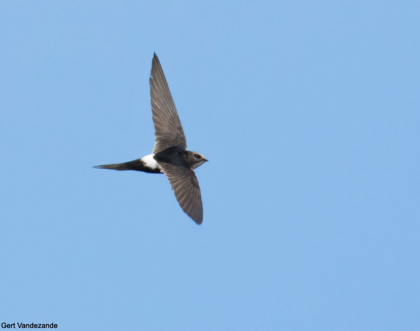 Le 14 juillet 2020 (le dernier jour de son séjour !), alors qu’il examinait les nombreux martinets (noir, à ventre blanc et peut-être pâle) et hirondelles (de rochers, rustique, de fenêtre et rousseline), Gert a repéré un martinet différent, noir avec le croupion blanc et la queue fourchue : il s’agissait d’un Martinet cafre (Apus caffer), une espèce qui n’avait été homologuée que deux fois en France auparavant, à l’aire de répartition essentiellement subsaharienne. L’espèce a été revue ensuite à Minerve chaque été depuis 2022, et François Decrion (Photo Club Mailhacois) a noté à nouveau un individu (et peut-être deux) le 14 juin 2025.