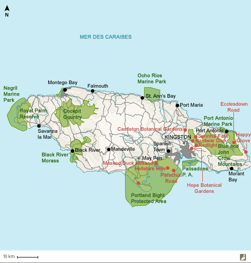 Carte de la Jamaïque et emplacements des sites visités durant le séjour