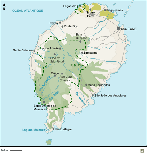 L’archipel de São Tomé et Príncipe, ancienne possession portugaise, est situé dans le golfe de Guinée à environ 300 km des côtes du Gabon. Il est formé de deux îles principales, Sao Tomé et Principe, et d’une quinzaine d’îlots. L’ensemble du territoire couvre une superficie d’environ 1 000 km². Le relief volcanique culmine à plus de 2 000 mètres, le climat est de type équatorial. Cet archipel est largement ignoré des naturalistes alors qu’il abrite une flore et une faune endémiques d’un très grand intérêt scientifique. On y trouve 27 espèces d’oiseaux uniques au monde, un chiffre proche de celui des célèbres Galápagos sur une superficie bien inférieure. On peut ainsi rencontrer sur Sao Tomé le plus grand souimanga et le plus grand tisserin du monde, ainsi que le plus petit ibis.