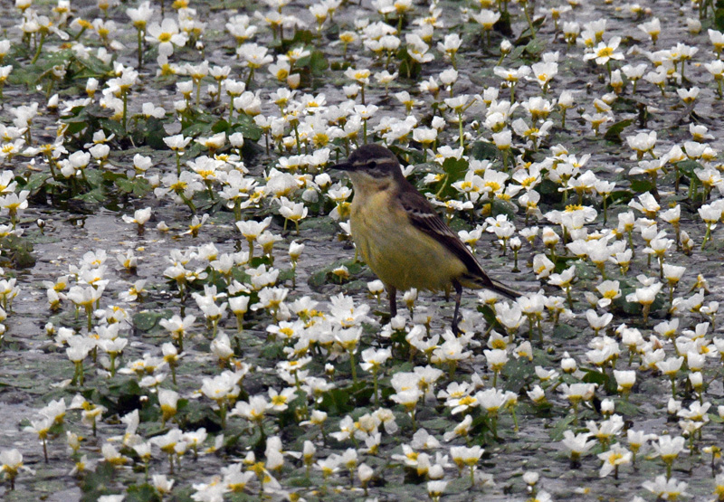 Migration interrompue par les mauvaises conditions atmosphériques (fortes pluies et vent). Plus d'une centaine de Bergeronnettes printanières de différentes sous-espèces (flava, flavissima, cinereocapilla, etc.) marchent sur le tapis de fleurs d'eau avec une dizaine de pipits spioncelles. Egalement, des dizaines d'hirondelles rustiques en vol rasant au-dessus de la mare, certaines posées sur des branches basses.
