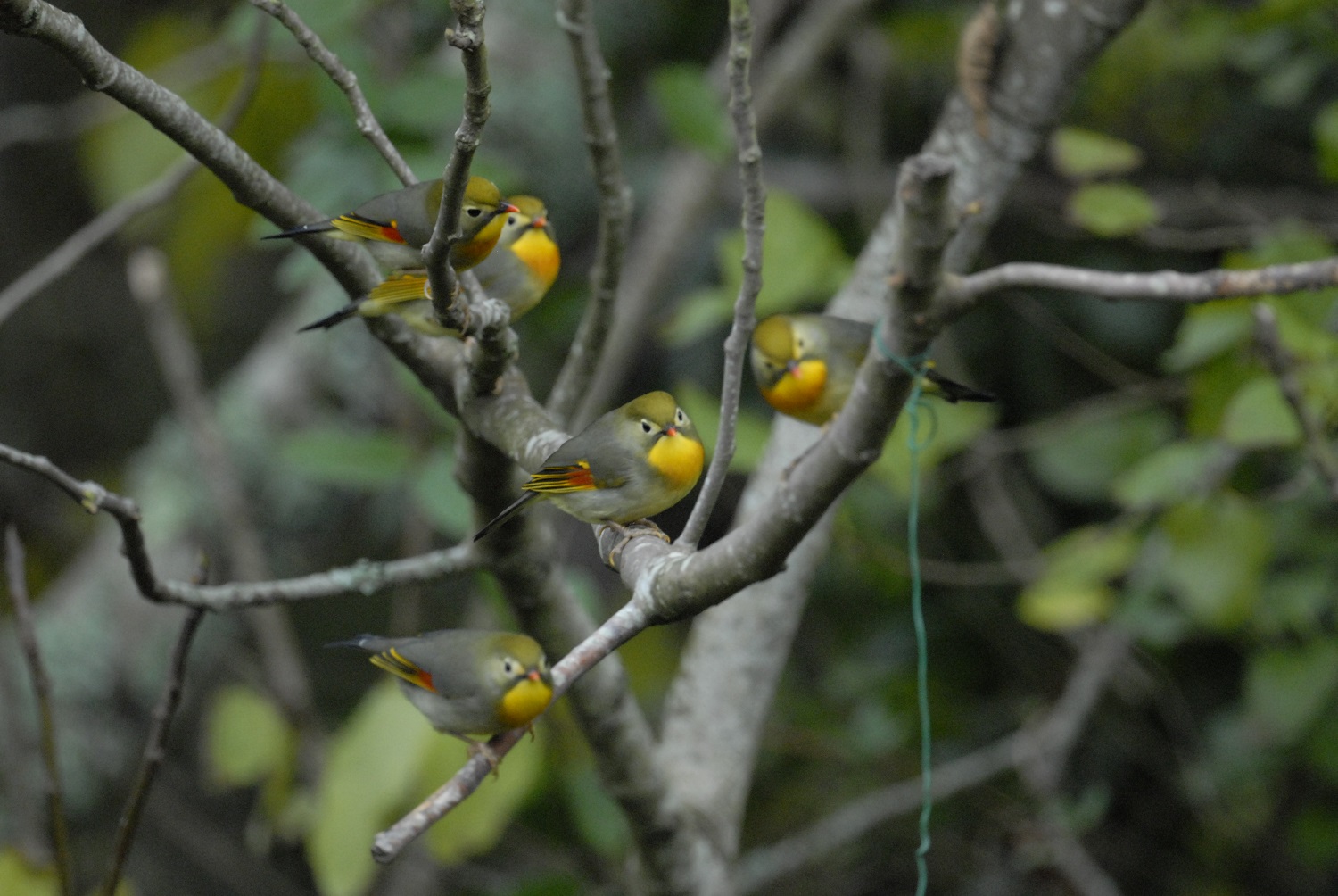 Petit groupe d'une dizaine de Léiothrix jaunes.