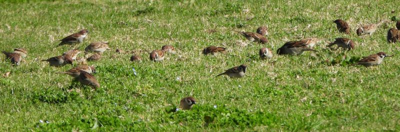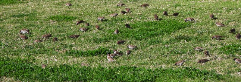 Au moins une centaine de moineaux friquets avec quelques rares moineaux cisalpins, une dizaine de bruants zizis, une trentaine d'étourneaux sansonnets, quelques serins cinis et chardonnerets élégants, se nourrissant sur la pelouse entre le cimetière marin d'Ajaccio et la mer.