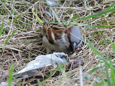 ce moineau s'est acharné sur un aute moineau mort entre 14h et 19 h . Il lui a arraché toutes les plumes de la tête, et j'ai pu m'approcher à moins d'un mètre sans qu'il ne m'accorde un coup d'oeil. Comment expliquer ce comportement ?