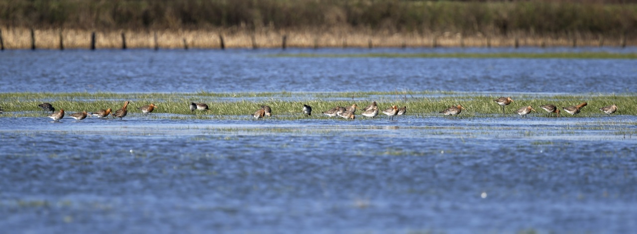 Observation avec Bernard Fontaine de 31 Barges à queue noire posées sur la prairie inondée.