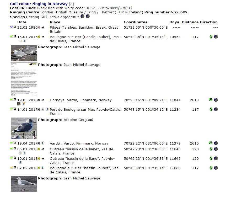 Bagué en Grande-Bretagne lors de son 2ème cycle, puis capturé dans le nord de la Norvège en juin 2016, soit à plus de 2 600 km (bague couleur + data logger ). Son âge : 32 ans et 7 mois !