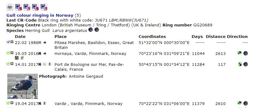 Bagué lorsqu'il était dans son second cycle, donc il est âgé de 32 ans et 6 mois. Il niche dans le Grand Nord norvégien, à plus de 2600 km d'Outreau. Photo de l'oiseau prise par A.Gergaud