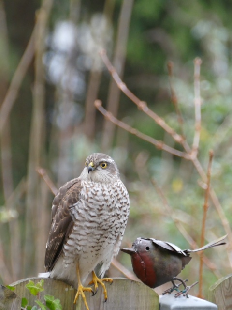 J'ai observé pour la première fois un épervier dans notre jardin. Il a peut-être été attiré par cette figurine de rougegorge qui peut évoquer un Merle noir par sa taille.