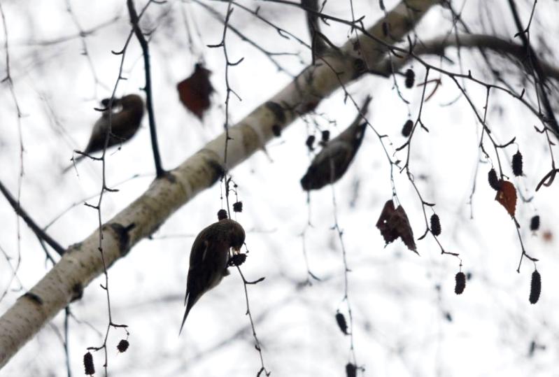 Présents depuis 2 semaines, ils font partie de ces oiseaux nordiques (mésange noire, pinson du Nord, Grosbec, Tarins...) particulièrement bien présents cette hiver par chez nous. On les observe souvent dans les bouleaux et les aulnes ou aux mangeoires avec d'autres fringillidés.