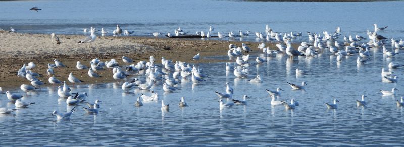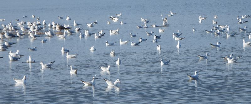 Etonnant rassemblement par une mer ultra calme depuis plusieurs jours. Avec quelques goélands leucophées, une aigrette garzette et quelques corneilles mantelées.