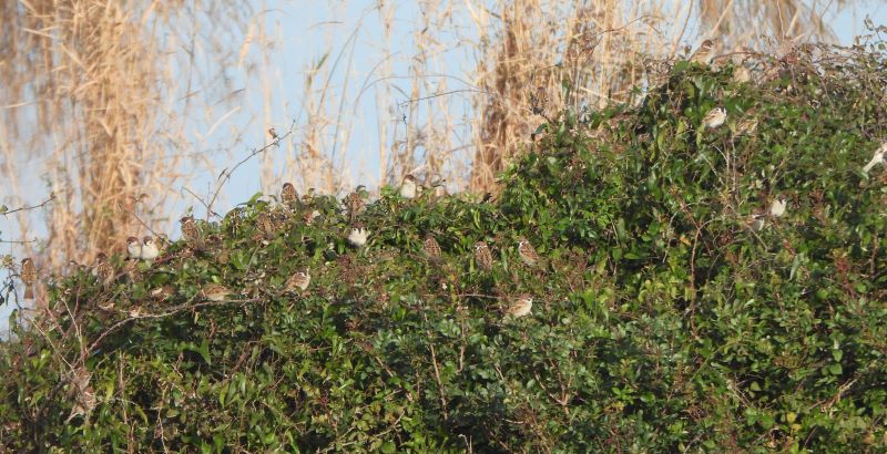 Se nourrissant dans les graminées dessous le falaise de Capitello, sur la rive gauche des rivières. Quasiment invisibles, le passage d'un couple avec chien les a fait s'envoler vers un buisson.