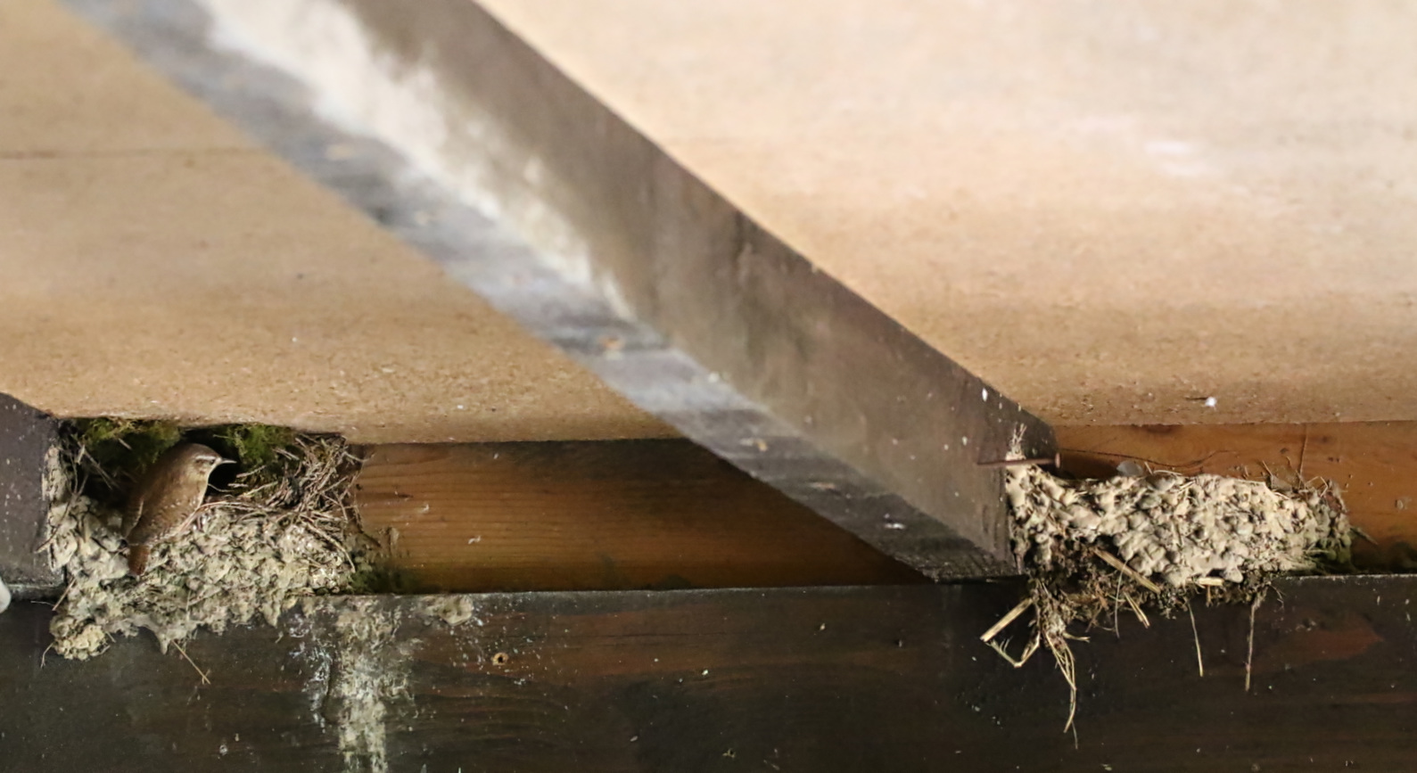 Il a construit son nid sur celui d'une hirondelle de l'année passée, à droite d'un nid actif de l'année.