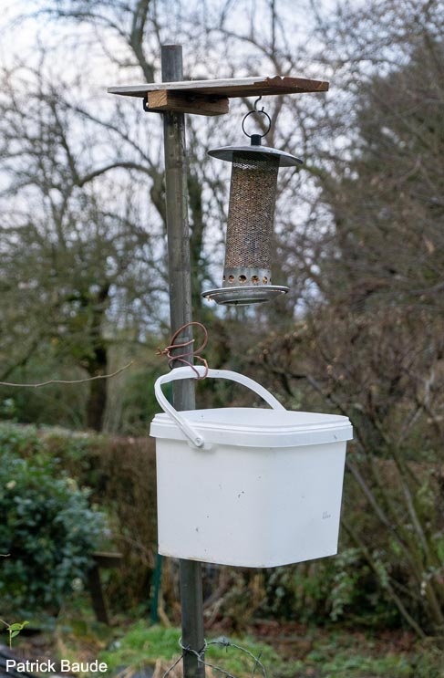 Par ailleurs, pour les empêcher de récupérer au sol les graines d’une mangeoire tubulaire placée aussi sur un poteau, il a attaché à celui-ci un petit seau, et là aussi, le bricolage a donné de bons résultats.