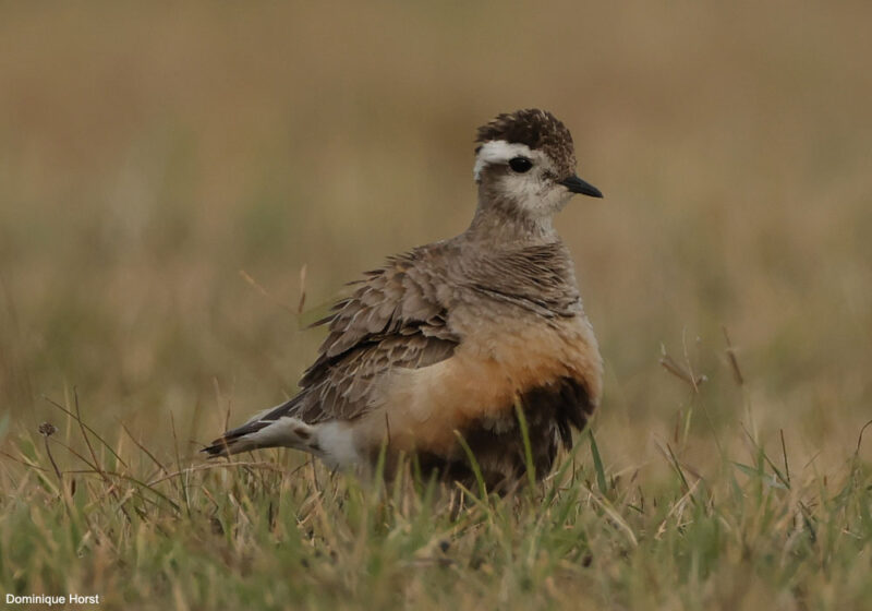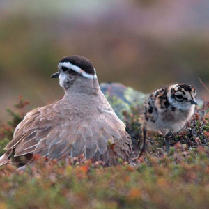 The Eurasian Dotterel (Eudromias morinellus) is an elegant wader: the adult plumage is brightly colored (females are more colored than males), including a deep ruddy belly marked with black, a black cap and white eyebrows that converge on the neck to form a « V ». The plumages of the young and the post-breeding adults are duller and scaly. This species breeds mainly from Scotland to Eastern Siberia, in Central Asia and in some mountains in continental Europe (Carpathian, Alps and Pyrenees).