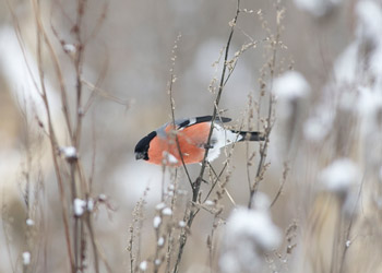 Bouvreuil pivoine (Pyrrhula pyrrhula) mâle se nourrissant de graines de fleurs dans une friche à Nassogne (Belgique) en janvier 2013. |