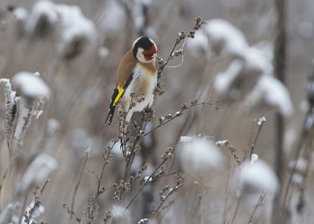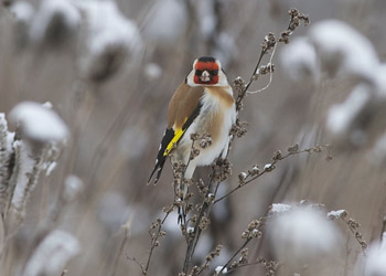 Chardonneret élégant (Carduelis carduelis) se nourrissant de graines de fleurs dans une friche à Nassogne (Belgique) en janvier 2013. |