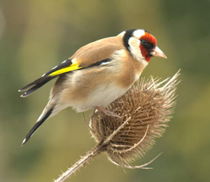 Chardonneret élégant (Carduelis carduelis) se nourrissant de graines de Cardère sauvage (Dipsacus fullonum) à Asquillies (Belgique) le 16/03/2013. |