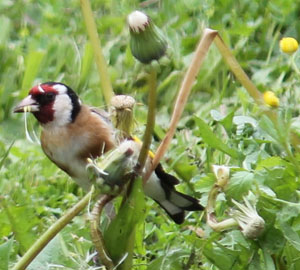 Chardonneret élégant (Carduelis carduelis) se nourrissant de graines de Pissenlit (Taraxacum officinale) à Mouzieys-Panens (Tarn) le 1er mai 2015. |