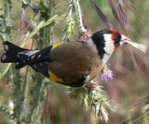 Chardonneret élégant (Carduelis carduelis) se nourrissant de graines de Cirse commun (Cirsium vulgare) à Port-Saint-Louis-du-Rhône (Bouches-du-Rhône) le 22/05/2008. |