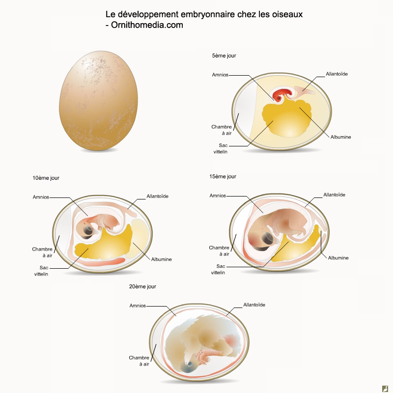 The egg of a bird is surrounded by a calcareous shell which protects its contents. It is composed of various elements like the yolk that contains some nutrients, the vitelline bag with a highly vascular wall, the amnion which acts as a « shock absorber », the albumen which is rich in proteins and water, and the allantochorion that facilitates gas exchanges. The embryonic development is a complex process during which cells multiply and differentiate to form the organs.