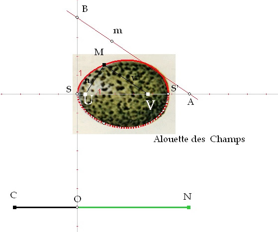 Utilisation de l'œuf de Descartes (en rouge) pour représenter la forme d'un œuf d'Alouette des champs (Alauda arvensis)