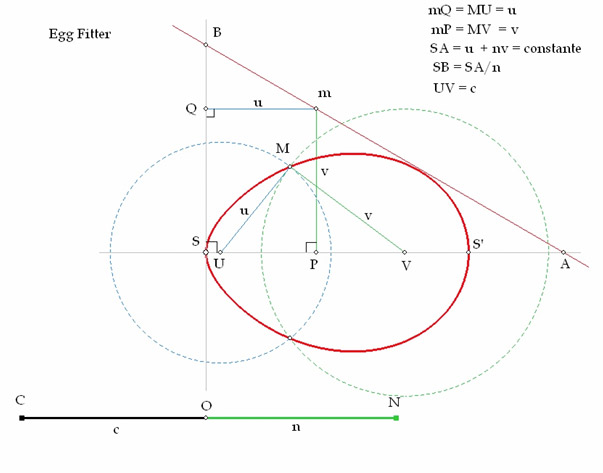 L’ovale de Descartes correspond à l’ensemble des points dont la moyenne pondérée des distances est constante. On utilise pour cela deux cercles, de centre U et de rayon u = mQ et de centre V et de rayon v = mP, qui se croisent en un point M (voir le schéma 1 ci-dessous) : lorsque le point m décrit une ligne AB, le point M décrit la courbe en rouge, que l’on appelle ovale de Descartes. Elle est définie par le fait que MU + nMV (avec n = SA/SB) reste constant, quelle que soit la position de M sur l’ovale : on obtient par exemple une ellipse quand n = 1.