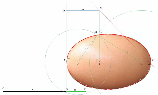 Utiliser un ovale cartésien pour représenter un œuf : il suffit de faire coïncider son grand axe avec les points S et S’, puis à l’aide des curseurs OC et ON, d’ajuster au mieux sa forme.