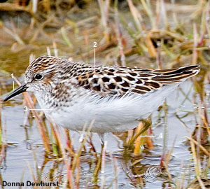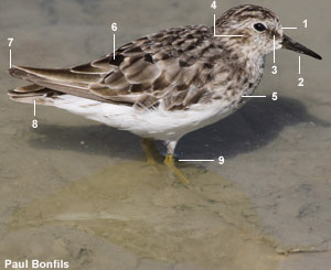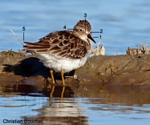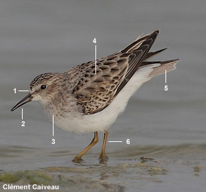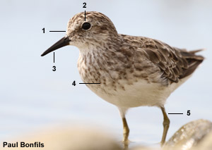 Bécasseau minuscule (Calidris minutilla) adulte dans le Grau de Piémanson en Camargue (Bouches-du-Rhône) le 9 août 2016. Notez (1) le front blanc et les lores sombres, (2) le cercle oculaire pâle assez visible, (3) le bec court légèrement recourbé, (4) la bande pectorale striée et (5) les pattes jaunâtres. Notez aussi les parotiques (joues) sombres (cliquez sur la photo pour l’agrandir) |