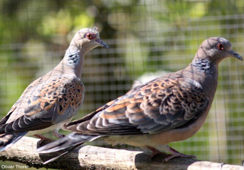 Tourterelles des bois (Streptopelia turtur) (à gauche) et orientale (Streptopelia orientalis) adultes. Cette dernière espèce est assez fréquemment détenue en captivité, où elle se reproduit bien.